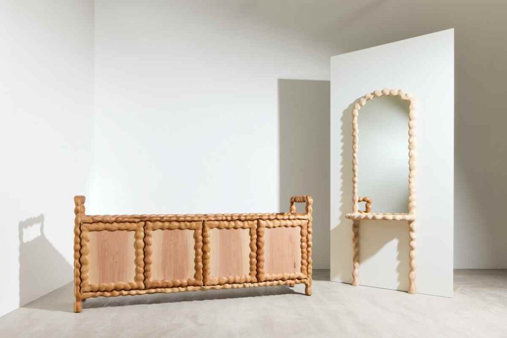 Per No.1 Common, Øfstedal Eng ha progettato un armadio e uno specchio da parete ispirati alla sperimentazione materiale utilizzando la caratteristica betulla gialla. Le sue scoperte si collegano strettamente alla sua ispirazione di lunga data che trova nelle radici e nei rami – forme che si torcono e modellano sia la struttura che la silhouette.