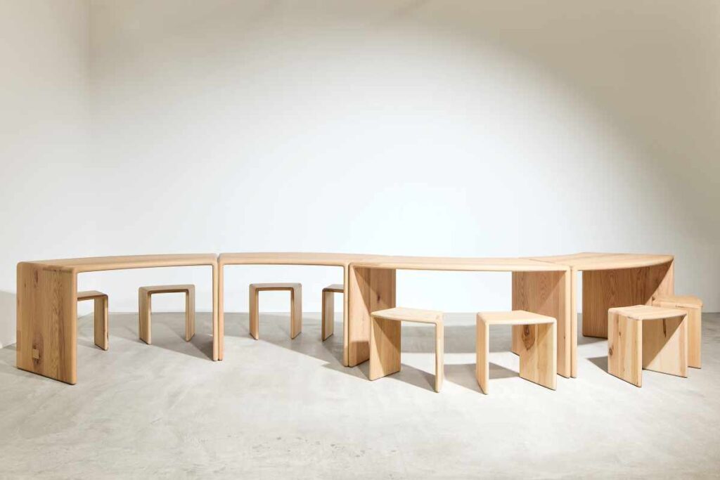 Realizzato in quercia rossa No.1 Common, il tavolo è composto da otto segmenti curvi che vengono riorganizzati in vari modi durante l’esposizione. Man mano che la superficie evolve diventa un palcoscenico per oggetti che invitano alla connessione – e una tela dove rimangono dipinte le tracce lasciate da ogni evento.